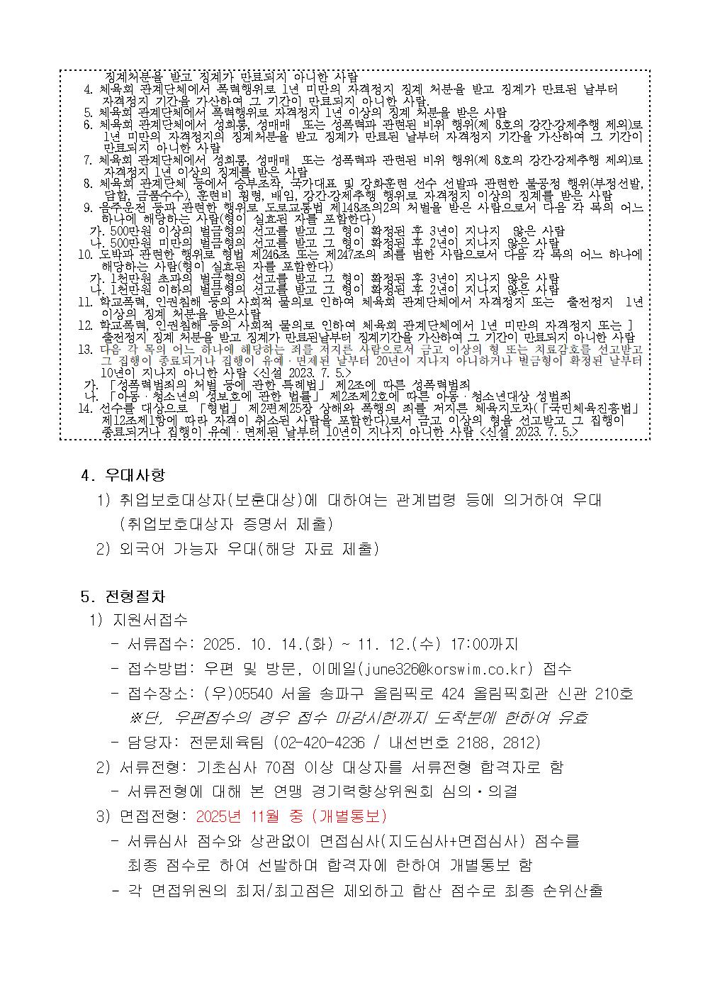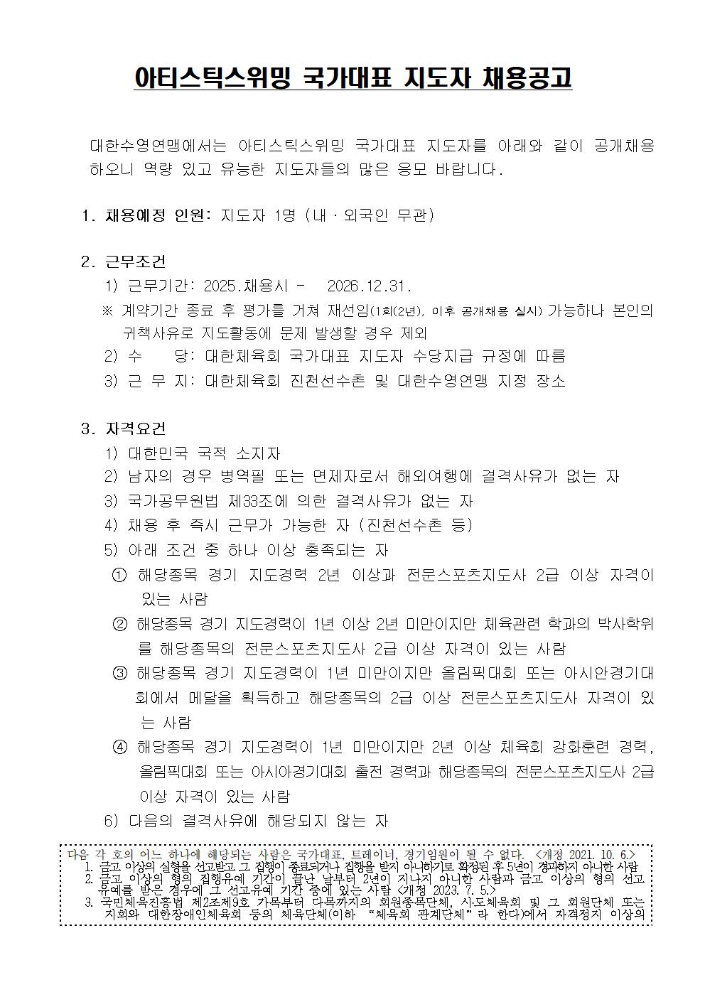 수영(아티스틱스위밍) 국가대표 지도자 채용 재공고(~11월 12일 17시 마감)
