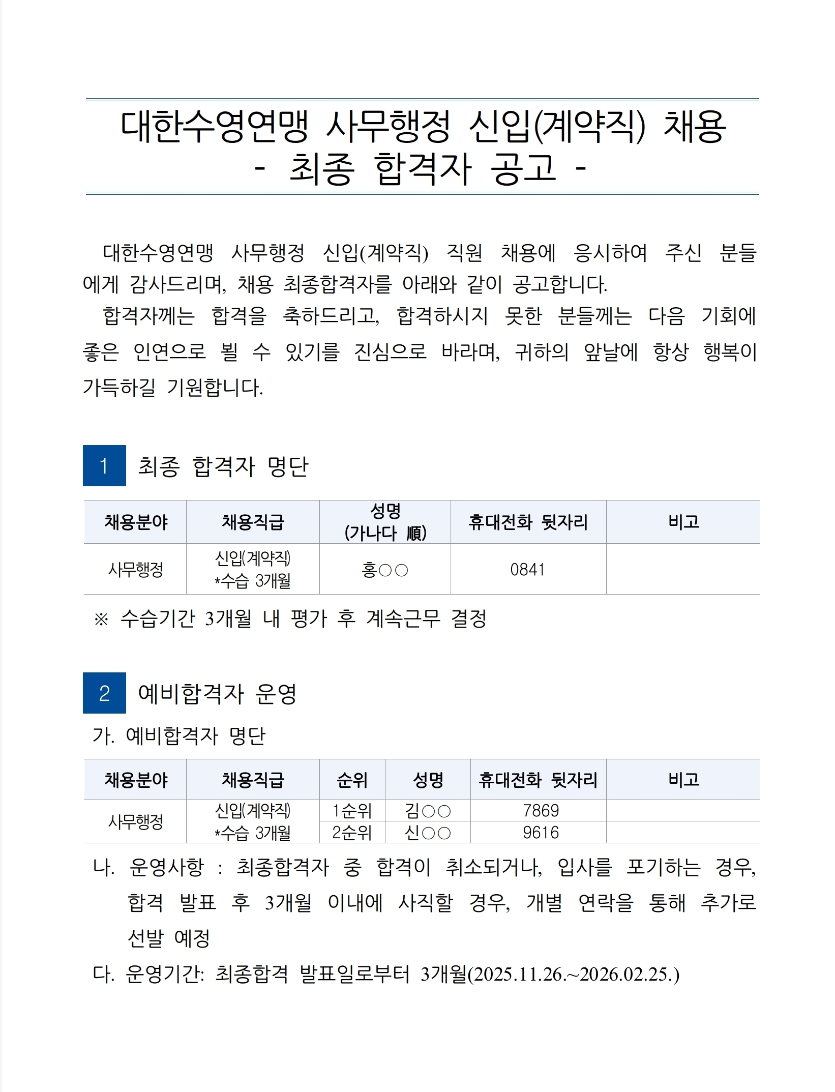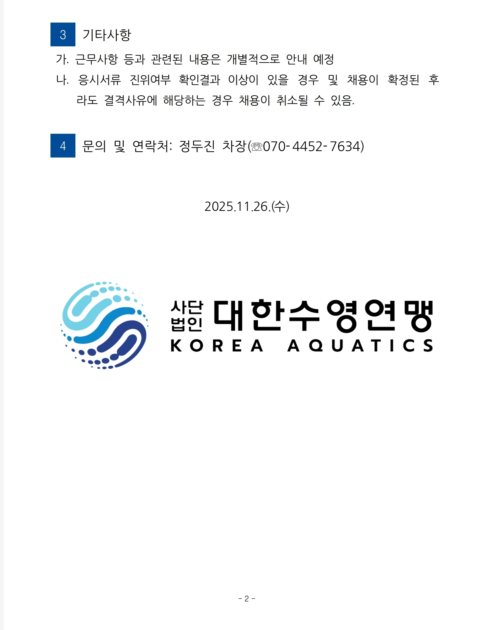 대한수영연맹 신입(계약직) 직원 채용 최종 합격자 공고(사무행정)
