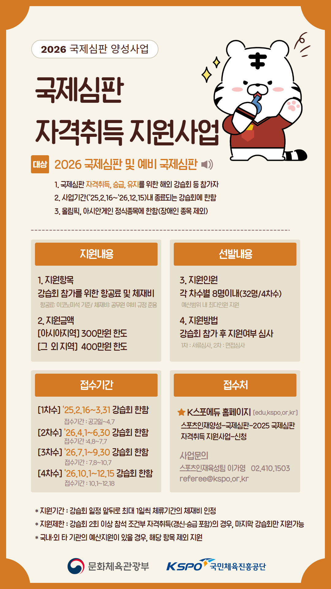 □ 지원대상: 올림픽·아시안게임 정식종목의 국제심판 자격취득·승급·유지를 위해 국제연맹에서 주관하는 해외 강습회 등 참가자