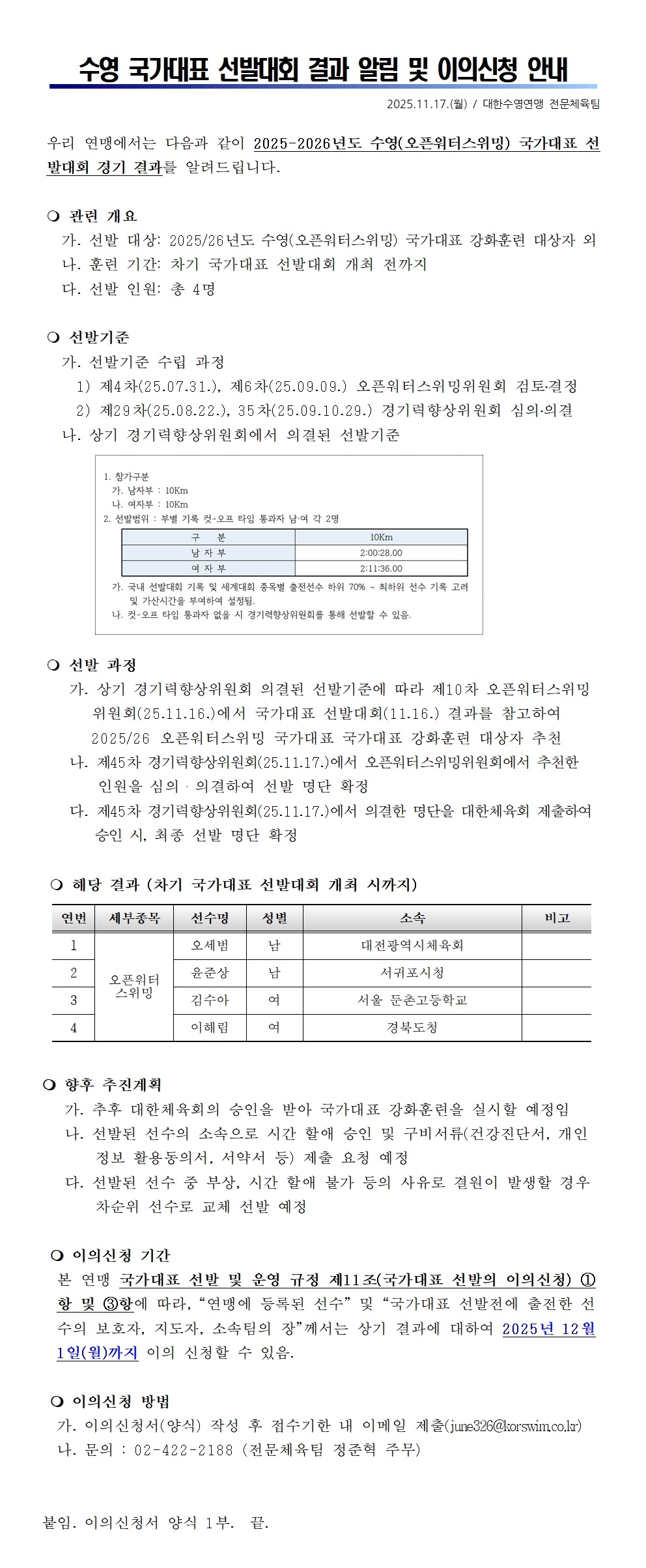 2025-26 수영(오픈워터) 국가대표 선발대회 결과 알림 및 이의신청 안내(~12.01.)