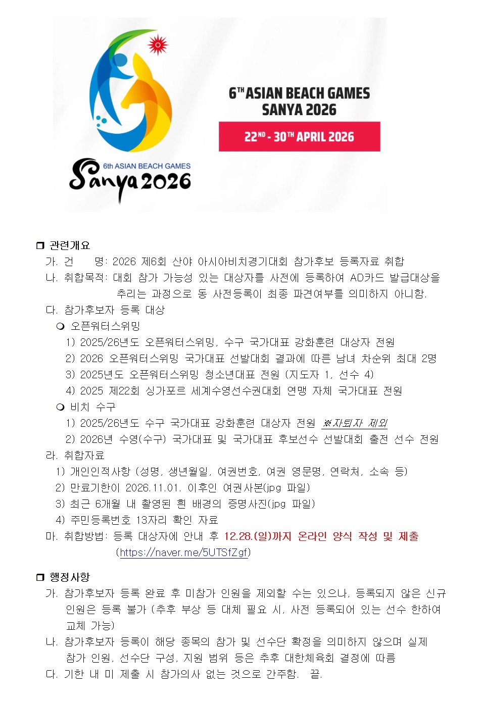 기한(~12.28.) 내 산야 아시아비치경기대회 참가후보자 등록자료를 제출하지 않으면,