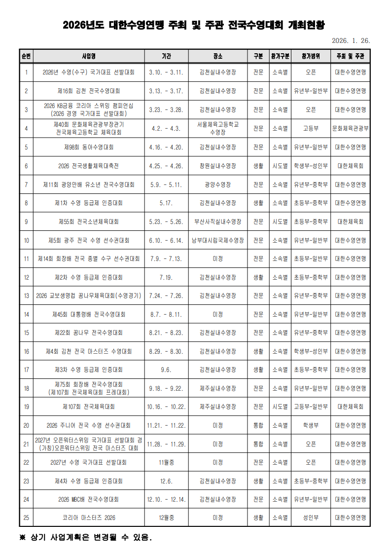 (1. 26.기준) 2026년도 대한수영연맹 주최 및 주관 전국수영대회 일정 안내