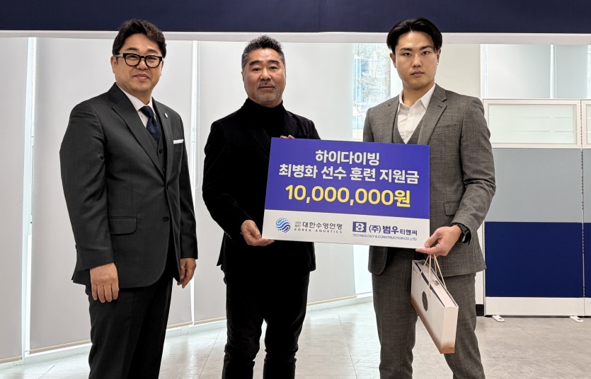 대한수영연맹(회장 정창훈)은 수영장 전문업체 ㈜범우티앤씨와 함께 하이다이빙 종목 발전을 위한 훈련 지원금 전달식을 개최했다고 26일 밝혔다.